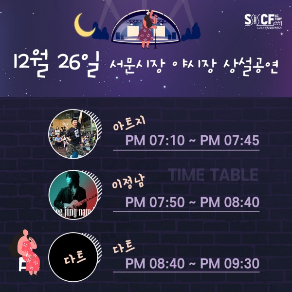 [행사안내] 서문야시장 상설무대 공연안내 12월 26일 페이지 정보 작성자 행사관리자 작성일21-12-26 18:07 조회949회 댓글0건 관련링크 이전글 다음글 목록 본문 12월 26일 오늘의 일정 입니다. 댓글목록 등록된 댓글이 없습니다. 이전글 다음글 목록