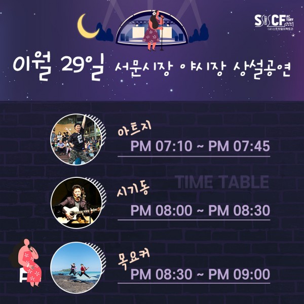 [행사안내] 서문야시장 상설무대 공연안내 01월 29일 페이지 정보 작성자 행사관리자 작성일22-01-29 18:55 조회911회 댓글0건 관련링크 이전글 다음글 목록 본문 1월 29일 오늘의 일정 입니다. 댓글목록 등록된 댓글이 없습니다. 이전글 다음글 목록
