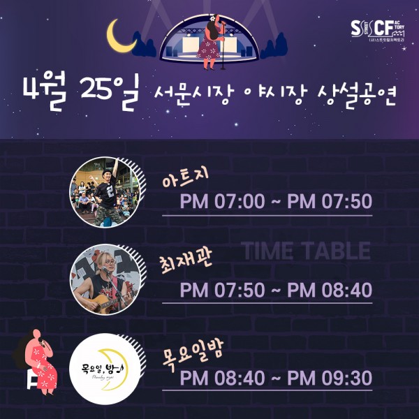 [행사안내] 서문야시장 상설무대 공연안내 4월 25일 페이지 정보 작성자 행사관리자 작성일21-04-25 19:26 조회1,049회 댓글0건 관련링크 이전글 다음글 목록 본문 4월 25일 오늘의 일정 입니다. 댓글목록 등록된 댓글이 없습니다. 이전글 다음글 목록