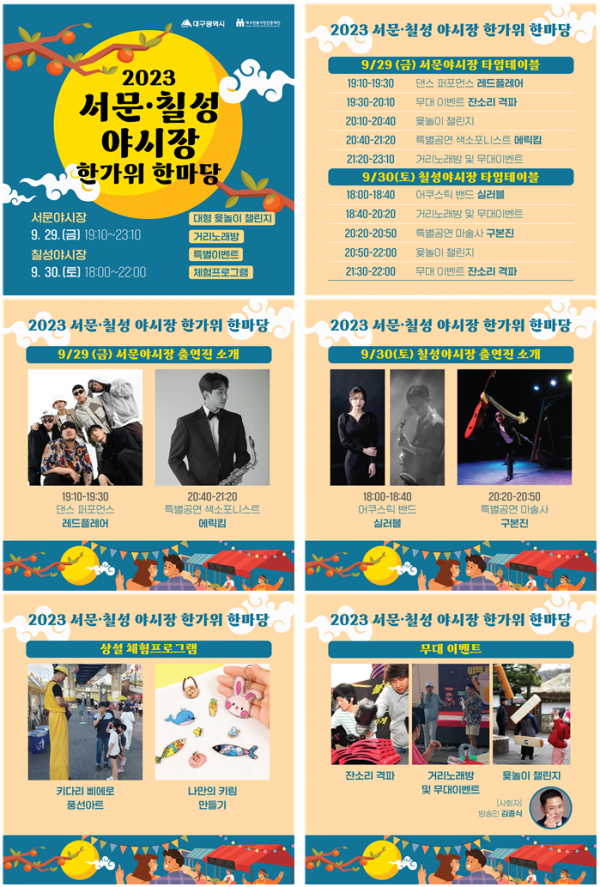 서문야시장 추석연휴기간 행사 일정 및 정상영업안내 페이지 정보 작성자 마스터 작성일23-09-26 15:07 조회7,490회 댓글0건 관련링크 이전글 다음글 목록 본문 서문야시장 추석연휴기간 정상영업안내 영업시간 안내 : 금, 토 19:00 ~ 23:30 / 일 19:00 ~22:30 ※9월 28일(목)은 정기휴무일 입니다, 서문야시장은 영업하지 않습니다. 많은 관심 부탁드립니다. 감사합니다. 댓글목록 등록된 댓글이 없습니다. 이전글 다음글 목록