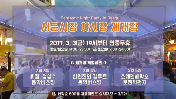 2017년 3월 3일(금) 19:00 부로 재개장되는 서문시장 야시장!