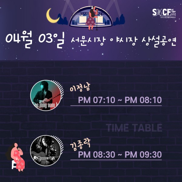 [행사안내] 서문야시장 상설무대 공연안내 04월 03일 페이지 정보 작성자 행사관리자 작성일22-04-03 18:04 조회1,004회 댓글0건 관련링크 이전글 다음글 목록 본문 4월 3일 오늘의 일정 입니다. 댓글목록 등록된 댓글이 없습니다. 이전글 다음글 목록