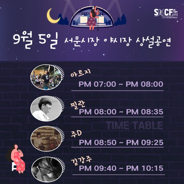 [행사안내] 서문야시장 상설무대 공연안내 9월5일 페이지 정보 작성자 행사관리자 작성일20-09-05 12:39 조회1,228회 댓글0건 관련링크 이전글 다음글 목록 본문 9월 5일 오늘의 일정입니다. 댓글목록 등록된 댓글이 없습니다. 이전글 다음글 목록