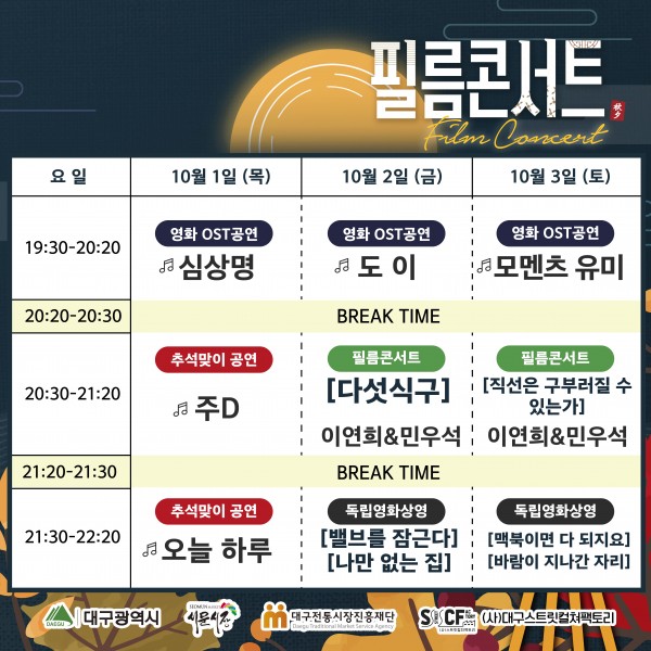 서문시장 야시장 상설무대 <필름콘서트> 페이지 정보 작성자 행사관리자 작성일20-10-01 00:45 조회1,163회 댓글0건 관련링크 이전글 다음글 목록 본문 서문시장 야시장 상설무대에서10월 1일부터 3일간 진행되는 <필름콘서트> !다양한 영화 OST 곡을 불러주는 아티스트들과,영화에 맞춘 곡을 직접 연주자가 연주해 주는 색다른 공연,그리고 대구의 독립영화들까지 감상하실 수 있습니다! 댓글목록 등록된 댓글이 없습니다. 이전글 다음글 목록