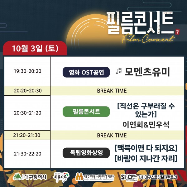 서문시장 야시장 상설무대 <필름콘서트> 10월 3일 페이지 정보 작성자 행사관리자 작성일20-10-03 11:46 조회1,118회 댓글0건 관련링크 이전글 다음글 목록 본문 서문시장 야시장 상설무대에서10월 1일부터 3일간 진행되는 <필름콘서트> !마지막날인 오늘은 영화 OST 곡을 불러주는 아티스트와영화에 맞춘 곡을 연주자가 직접 연주해 주는 색다른 공연,그리고 대구의 독립영화들까지 감상하실 수 있습니다! 댓글목록 등록된 댓글이 없습니다. 이전글 다음글 목록