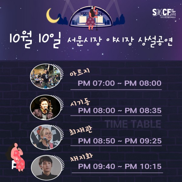 [행사안내] 서문야시장 상설무대 공연안내 10월 10일 페이지 정보 작성자 행사관리자 작성일20-10-10 13:10 조회1,136회 댓글0건 관련링크 이전글 다음글 목록 본문 10월 10일 오늘의 일정입니다. 댓글목록 등록된 댓글이 없습니다. 이전글 다음글 목록