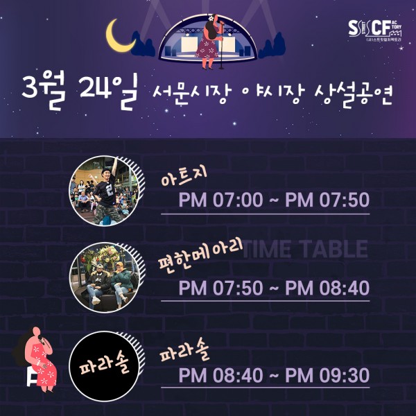 [행사안내] 서문야시장 상설무대 공연안내 3월 24일 페이지 정보 작성자 행사관리자 작성일21-03-24 17:46 조회989회 댓글0건 관련링크 이전글 다음글 목록 본문 3월 24일 오늘의 일정 입니다. 댓글목록 등록된 댓글이 없습니다. 이전글 다음글 목록