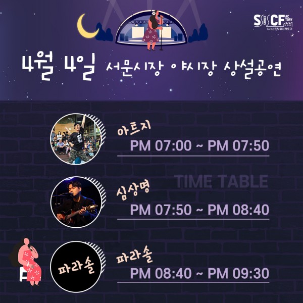 [행사안내] 서문야시장 상설무대 공연안내 4월 4일 페이지 정보 작성자 행사관리자 작성일21-04-04 15:53 조회1,079회 댓글0건 관련링크 이전글 다음글 목록 본문 4월 4일 오늘의 일정 입니다. 댓글목록 등록된 댓글이 없습니다. 이전글 다음글 목록