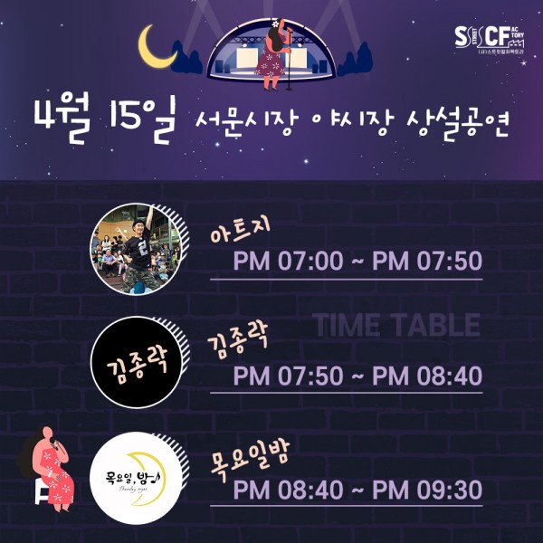 [행사안내] 서문야시장 상설무대 공연안내 4월 15일 페이지 정보 작성자 행사관리자 작성일21-04-15 15:09 조회1,056회 댓글0건 관련링크 이전글 다음글 목록 본문 4월 15일 오늘의 일정 입니다. 댓글목록 등록된 댓글이 없습니다. 이전글 다음글 목록