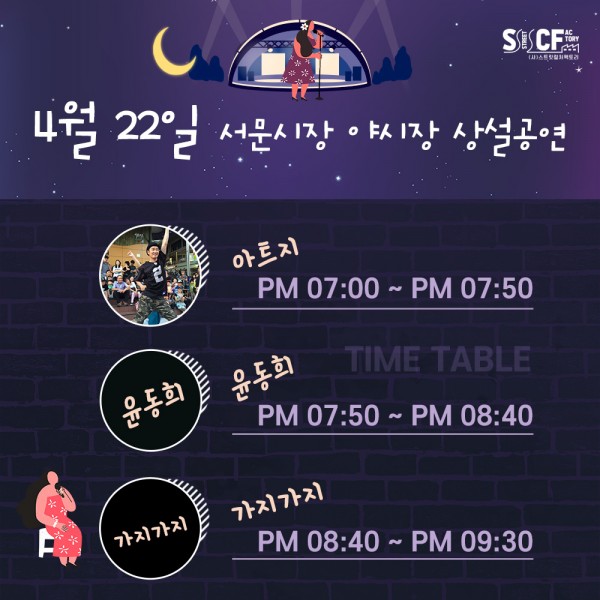 [행사안내] 서문야시장 상설무대 공연안내 4월 22일 페이지 정보 작성자 행사관리자 작성일21-04-22 11:38 조회1,004회 댓글0건 관련링크 이전글 다음글 목록 본문 4월 22일 오늘의 일정 입니다. 댓글목록 등록된 댓글이 없습니다. 이전글 다음글 목록