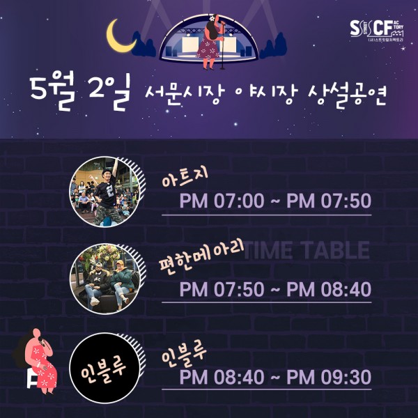 [행사안내] 서문야시장 상설무대 공연안내 5월 2일 페이지 정보 작성자 행사관리자 작성일21-05-02 12:49 조회979회 댓글0건 관련링크 이전글 다음글 목록 본문 5월 2일 오늘의 일정 입니다. 댓글목록 등록된 댓글이 없습니다. 이전글 다음글 목록