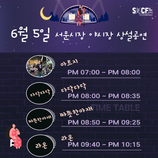 [행사안내] 서문야시장 상설무대 공연안내 6월 5일 페이지 정보 작성자 행사관리자 작성일21-06-05 12:44 조회946회 댓글0건 관련링크 이전글 다음글 목록 본문 6월 5일 오늘의 일정 입니다. 댓글목록 등록된 댓글이 없습니다. 이전글 다음글 목록