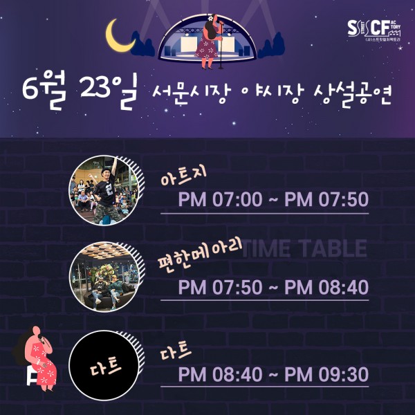 [행사안내] 서문야시장 상설무대 공연안내 6월 23일 페이지 정보 작성자 행사관리자 작성일21-06-23 12:57 조회990회 댓글0건 관련링크 이전글 다음글 목록 본문 6월 23일 오늘의 일정 입니다. 댓글목록 등록된 댓글이 없습니다. 이전글 다음글 목록