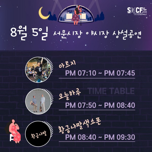 [행사안내] 서문야시장 상설무대 공연안내 8월 5일 페이지 정보 작성자 행사관리자 작성일21-08-05 20:30 조회967회 댓글0건 관련링크 이전글 다음글 목록 본문 8월 5일 오늘의 일정 입니다. 댓글목록 등록된 댓글이 없습니다. 이전글 다음글 목록