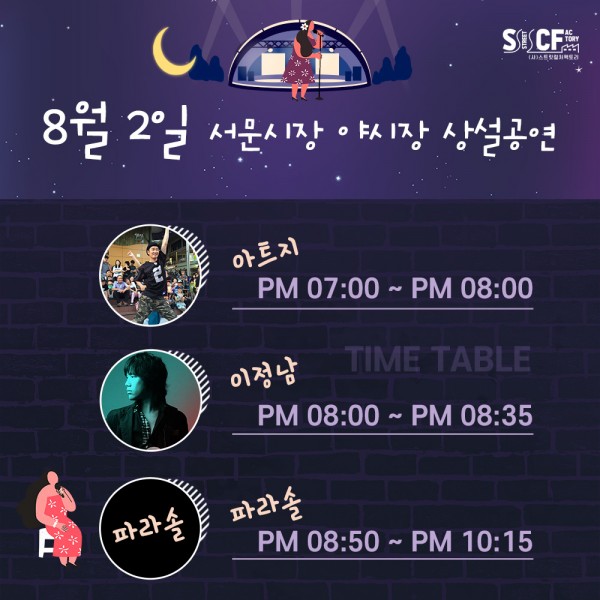 [행사안내] 서문야시장 상설무대 공연안내 8월2일 페이지 정보 작성자 행사관리자 작성일20-08-02 12:31 조회1,345회 댓글0건 관련링크 이전글 다음글 목록 본문 8월2일 오늘의 일정입니다. 댓글목록 등록된 댓글이 없습니다. 이전글 다음글 목록