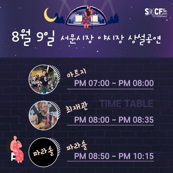 [행사안내] 서문야시장 상설무대 공연안내 8월9일 페이지 정보 작성자 행사관리자 작성일20-08-09 09:54 조회1,197회 댓글0건 관련링크 이전글 다음글 목록 본문 8월 9일 오늘의 일정입니다. 댓글목록 등록된 댓글이 없습니다. 이전글 다음글 목록