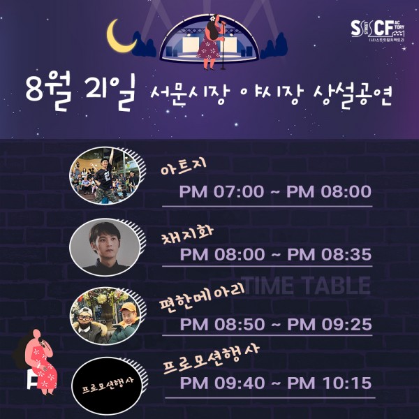 [행사안내] 서문야시장 상설무대 공연안내 8월21일 페이지 정보 작성자 행사관리자 작성일20-08-21 12:58 조회1,252회 댓글0건 관련링크 이전글 다음글 목록 본문 8월 21일 오늘의 일정입니다. 댓글목록 등록된 댓글이 없습니다. 이전글 다음글 목록