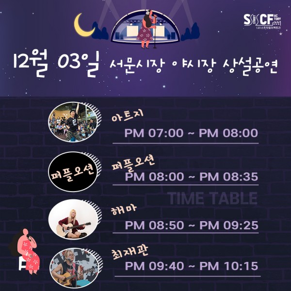 [행사안내] 서문야시장 상설무대 공연안내 12월 03일 페이지 정보 작성자 행사관리자 작성일21-12-03 16:12 조회878회 댓글0건 관련링크 이전글 다음글 목록 본문 12월 3일 오늘의 일정 입니다. 댓글목록 등록된 댓글이 없습니다. 이전글 다음글 목록