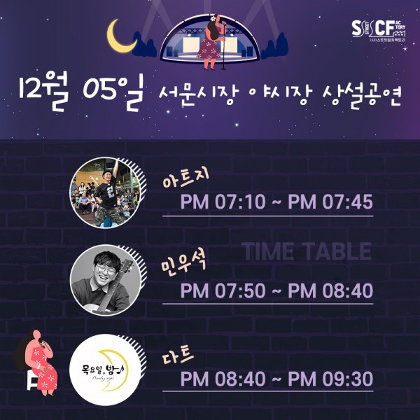 [행사안내] 서문야시장 상설무대 공연안내 12월 05일 페이지 정보 작성자 행사관리자 작성일21-12-05 18:39 조회869회 댓글0건 관련링크 이전글 다음글 목록 본문 12월 5일 오늘의 일정 입니다. 댓글목록 등록된 댓글이 없습니다. 이전글 다음글 목록
