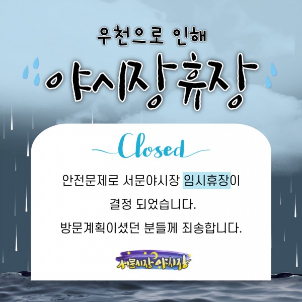 서문야시장 임시휴장 페이지 정보 작성자 마스터 작성일24-10-18 16:16 조회9,430회 댓글0건 관련링크 이전글 다음글 목록 본문 서문야시장 임시휴장 오늘 10월 18일 금요일 서문야시장은 우천 안전 대비를 위하여 임시휴장합니다내일 뵙겠습니다. 감사합니다 댓글목록 등록된 댓글이 없습니다. 이전글 다음글 목록