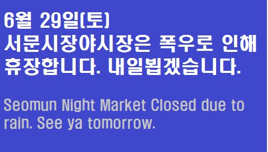 [긴급공지]6월 29일(토) 야시장 휴장안내 페이지 정보 작성자 마스터 작성일19-06-29 18:35 조회5,459회 댓글0건 관련링크 이전글 다음글 목록 본문 6월 29일(토) 서문시장야시장은 폭우로 인해 휴장합니다. 내일뵙겠습니다. 댓글목록 등록된 댓글이 없습니다. 이전글 다음글 목록